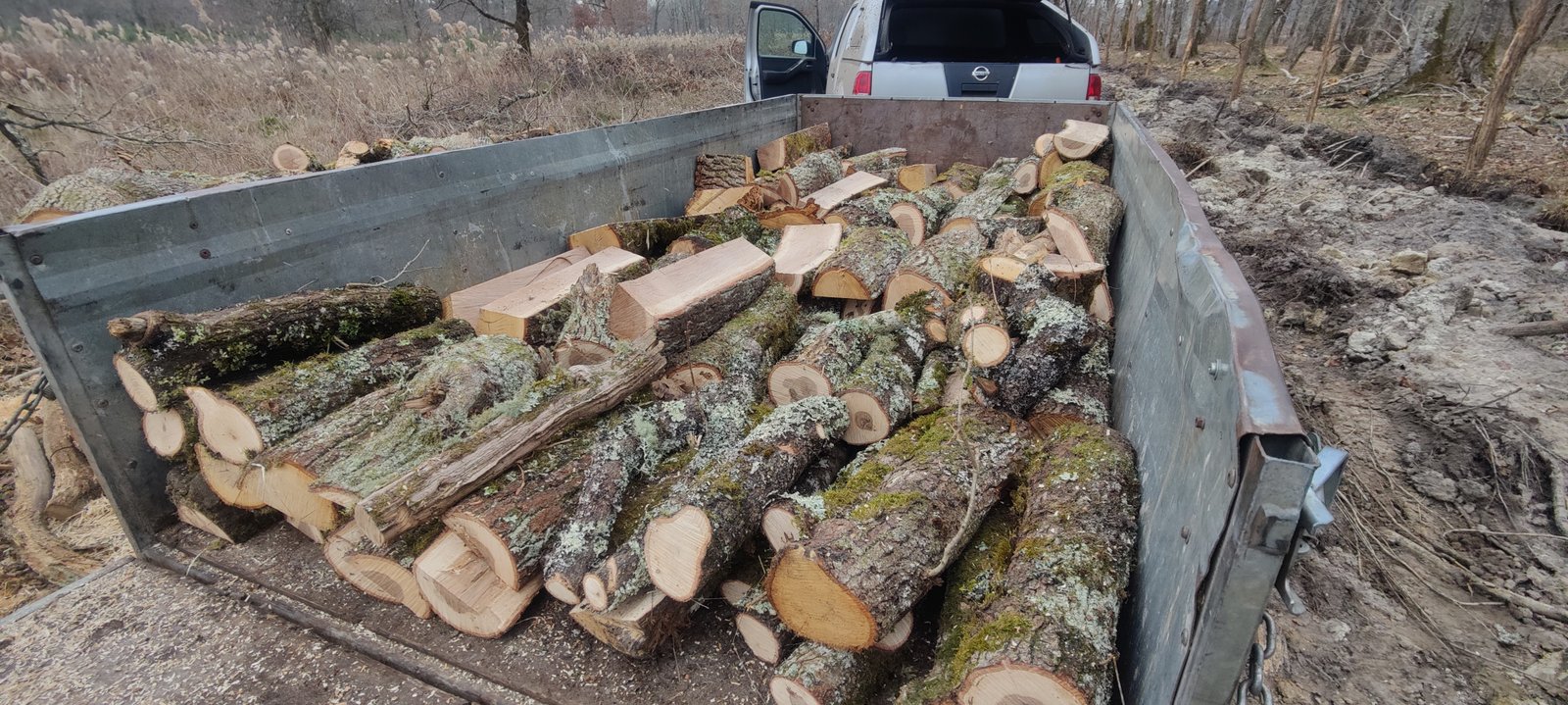 C'est notre remorque de longueur 3m, largeur 1m50 et hauteur 90cm et nous la comptons 4 stères. Une telle remorque de bois de chauffage chêne livré à Mont de Marsan coûte 300 euros.